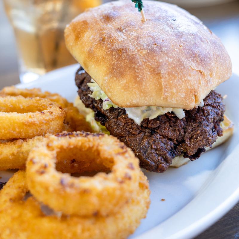 This is a classic! Served on grilled rye bread, topped with grilled onions & melted Swiss