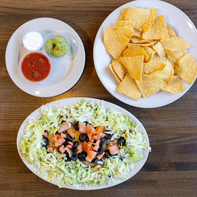 Jalapeno refried beans, cheese, lettuce, tomatoes, olives, guacamole, sour cream and salsa with a side of our house tortilla chips • Add seasoned taco meat $3.00 | Add chicken $3.00 | Extra cheese $2.50